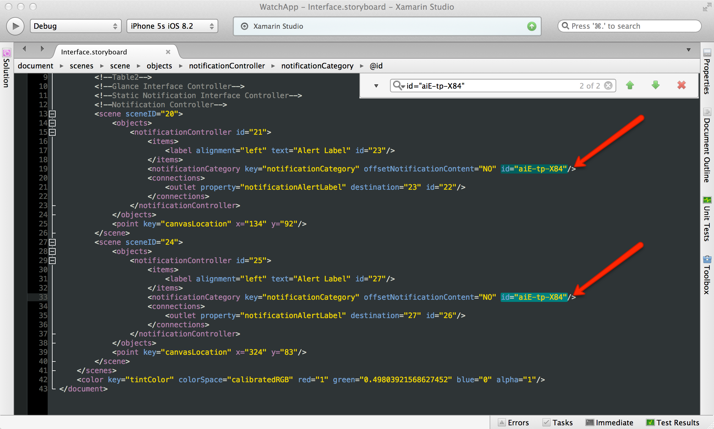 Xamarin 的 WatchKit 支持包括在 iOS 设计器中设计 Watch 情节提要(在 Visual Studio for Mac 和 Visual Studio 中都可以),而无需执行下面概述的步骤。 只需在 Visual Studio for Mac Properties Pad 中为接口控制器提供类名,即可自动创建 C# 代码文件。