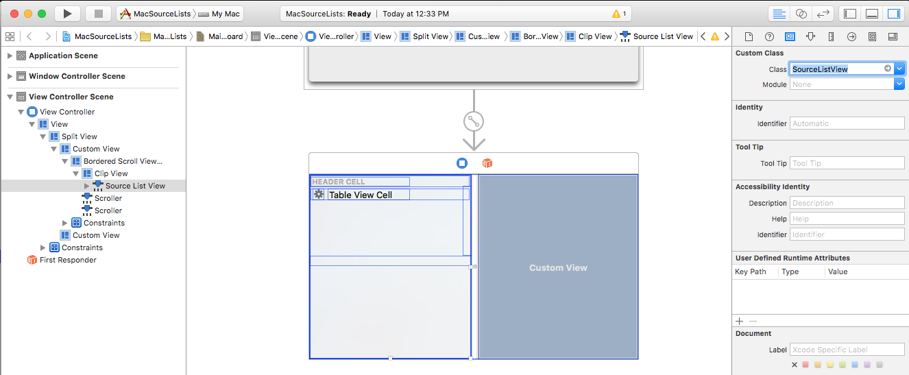 接下来,切换到“标识视图”,选择源列表,并将其类更改为 SourceListView: