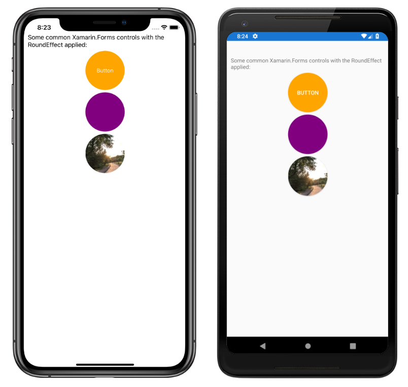 跨平台实现效果后,Xamarin.Forms 控件就可以使用这种效果。 RoundEffect 的常见应用是使 Image 对象成为圆形。 以下 XAML 显示了应用于 Image 实例的效果: