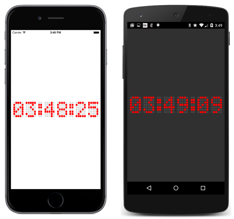 DotMatrixClock 示例使用模拟的 5x7 点矩阵显示来显示当前时间。 每个点的大小为 BoxView(其中包含 228 个),位于 AbsoluteLayout 上。