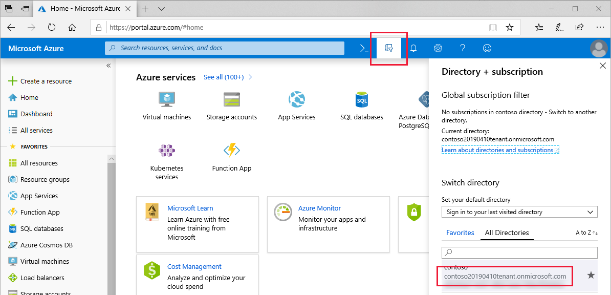 创建租户后,需要使用“租户名称”和“租户 ID”来配置移动应用程序。 租户 ID 和名称由创建租户 URL 时生成的域定义。 如果生成的租户 URL 为 https://contoso20190410tenant.onmicrosoft.com/,则“租户 ID”为 contoso20190410tenant.onmicrosoft.com,“租户名称”为 contoso20190410tenant。 单击顶部菜单中的“目录和订阅筛选器”,在 Azure 门户中查找租户域。 以下屏幕截图显示了 Azure 的“目录和订阅筛选器”按钮和租户域: