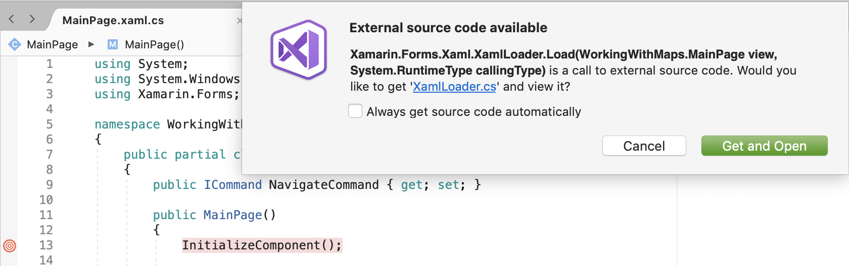 启用了调试外部包后,Visual Studio 将使用 NuGet 包中包含的 Source Link 映射来下载并单步执行外部源代码。 可以通过在调用 Xamarin.Forms 提供的方法时设置断点来测试这一项: