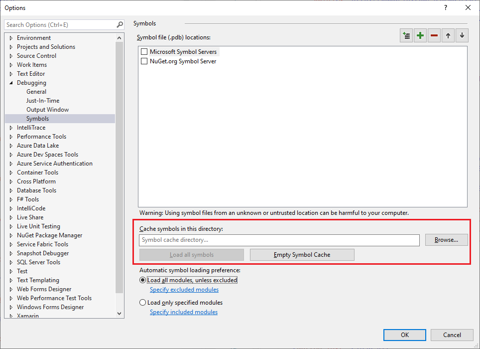 Source Link 使用缓存提高性能。 系统会在“符号”部分的“调试”下的“选项”菜单中定义源链接的缓存目录: