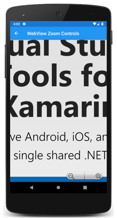 WebView.On<Android> 方法指定这一平台特定功能仅可在 Android 上运行。 Xamarin.Forms.PlatformConfiguration.AndroidSpecific 命名空间中的 WebView.EnableZoomControls 方法用于控制是否在 WebView 上启用捏合缩放。 同一命名空间中的 WebView.DisplayZoomControls 方法用于控制是否在 WebView 上覆盖缩放控件。 此外,WebView.ZoomControlsEnabled 和 WebView.ZoomControlsDisplayed 方法还可用于返回是否分别启用捏合缩放和缩放控件的结果。
