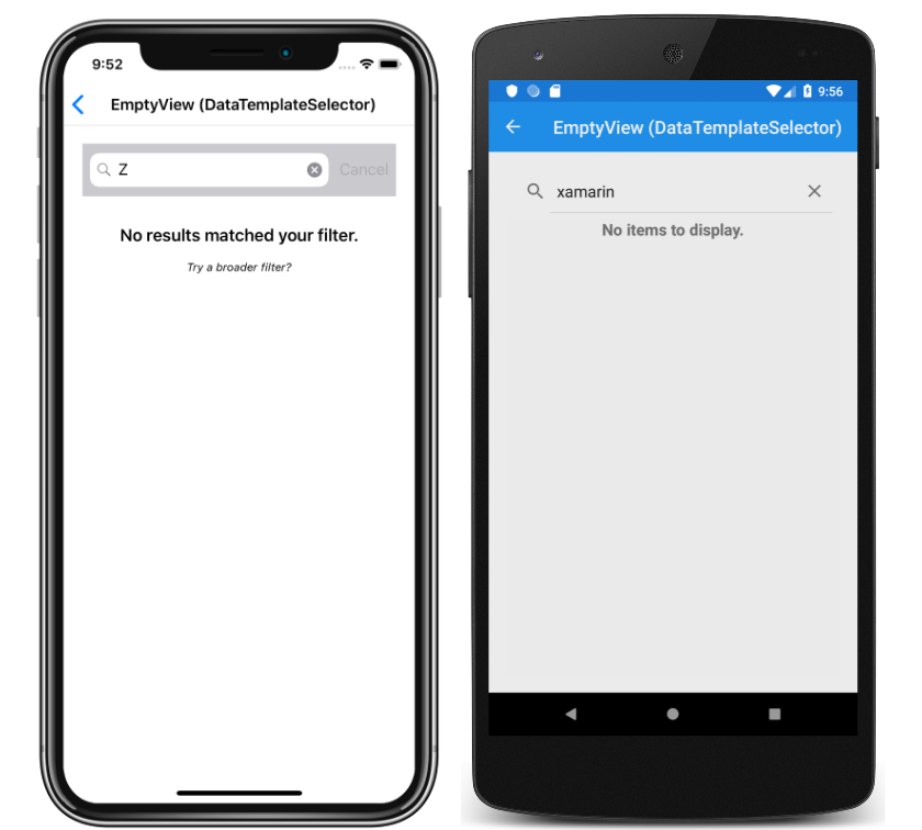 EmptyView 属性设置为 SearchBar.Text 属性,并且 EmptyViewTemplate 属性设置为 SearchTermDataTemplateSelector 对象。