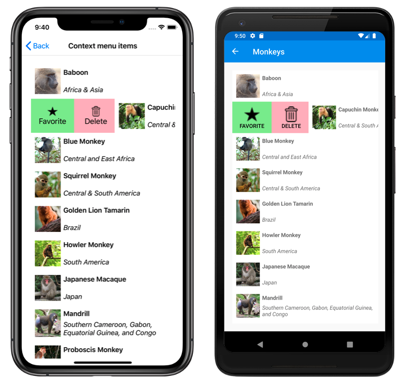 CollectionView 支持通过 SwipeView 查看上下文菜单的数据项,此控件通过轻扫手势显示上下文菜单。 SwipeView 是一个容器控件,该控件包围内容项,并为该内容项提供上下文菜单项。 因此,上下文菜单是通过创建用于定义 SwipeView 所围绕内容以及轻扫手势所显示上下文菜单项的 SwipeView,针对 CollectionView 实现的。 这可通过将 SwipeView 设置为 DataTemplate 中的根视图实现,该视图用于定义 CollectionView 中各数据项的外观: