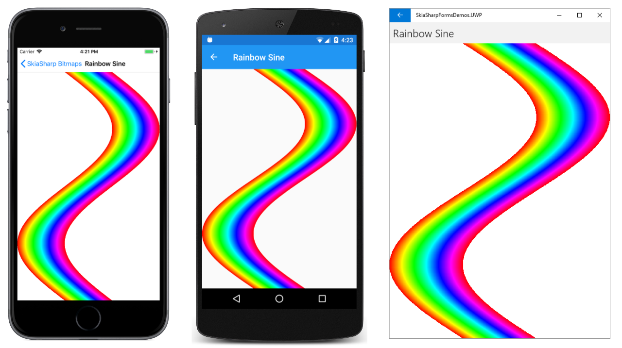 每个像素是四个字节的内存,因此必须单独设置每个字节。 此处的代码假定字节的顺序为红色、绿色、蓝色和 alpha,这与 SKColorType.Rgba8888 颜色类型一致。 你可能会记得,这是 iOS 和 Android 的默认颜色类型,但不适用于通用 Windows 平台。 默认情况下,UWP 会创建颜色类型为 SKColorType.Bgra8888 的位图。 因此,期望在该平台上看到一些不同的结果!