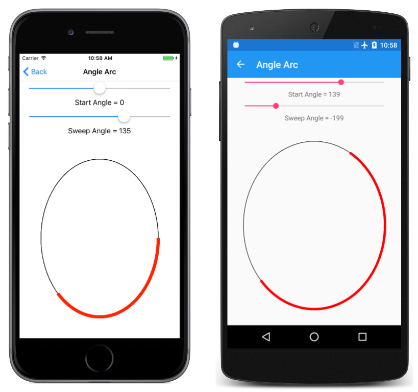 这些方法与 Android AddArc 和 [ArcTo]xref:Android.Graphics.Path.ArcTo*) 方法相同。 iOS AddArc 方法是相似的,但仅限于圆周上的弧线,而不是推广到椭圆形。