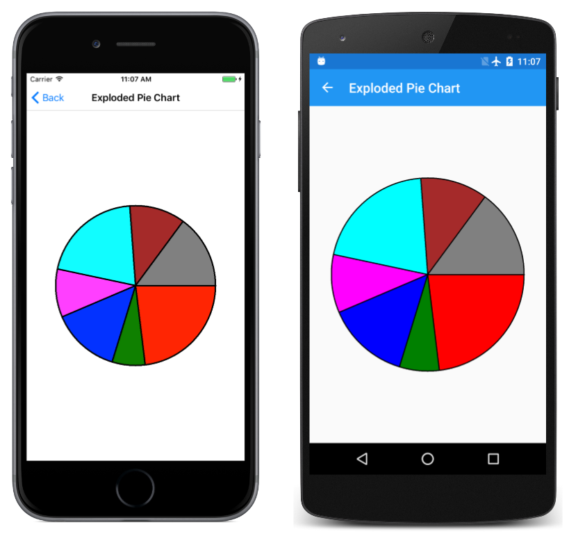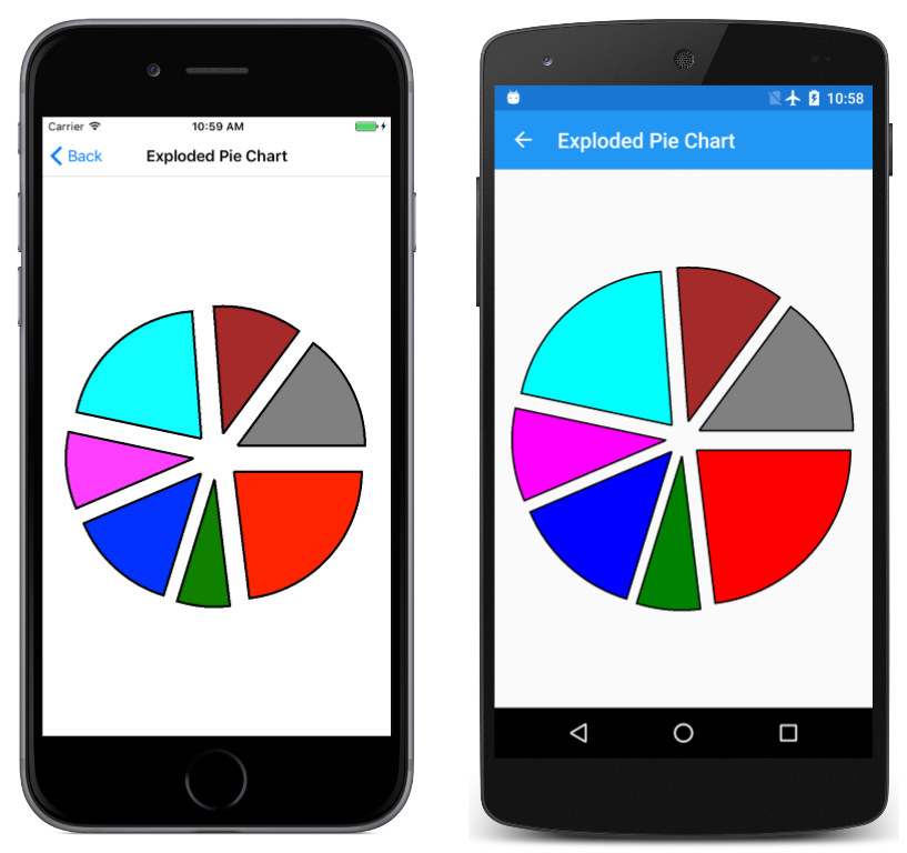 为每个饼图切片以创建新的 SKPath 对象。 该路径由中间的一条线组成,然后是绘制弧线的 ArcTo,另一条线时从 Close 调用返回的中心结果。 此程序通过将“分解”饼片从中心移出 50 像素来显示“分解”饼片。 该项任务需要每个切片的扫描角度中点方向上的一个矢量: