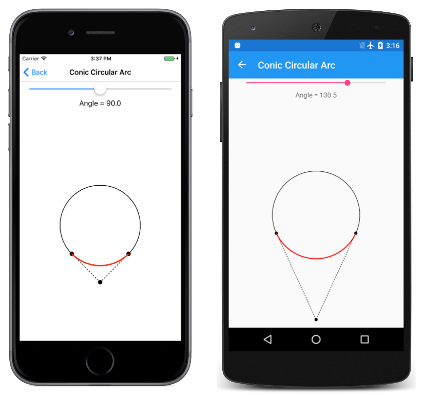 使用贝塞尔圆形弧线页,可以尝试定义贝塞尔曲线,以近似圆弧,角度范围高达 180 度。 BezierCircularArcPage.xaml 文件实例化 SKCanvasView 和用于选择角度的 Slider。 PaintSurfaceBezierCircularArgPage.xaml.cs 代码隐藏文件中的事件处理程序 使用转换将点 (0, 0) 设置为画布的中心。 它绘制一个以该点为中心的圆进行比较,然后计算贝塞尔曲线的两个控制点:
