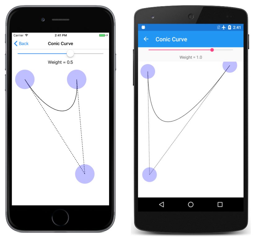 关于贝塞尔曲线的维基百科文章包含一些有用的背景信息。 贝塞尔曲线这一术语实际上指的是一系列类似的曲线。 SkiaSharp 支持三种类型的贝塞尔曲线,称为立方、二次和圆锥。 该圆锥体也称为理性二次。