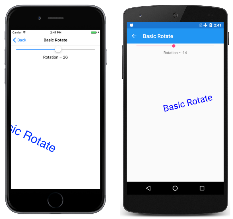 “基本旋转”页演示了 RotateDegrees 方法。 BasicRotate.xaml.cs 文件显示一些文本,文本的基线在页面中居中,并基于 Slider 旋转它(旋转范围为 -360 到 360)。 下面是 PaintSurface 处理程序的相关部分: