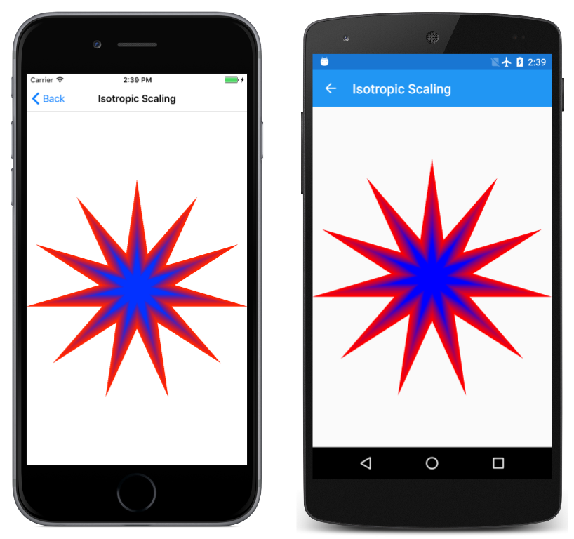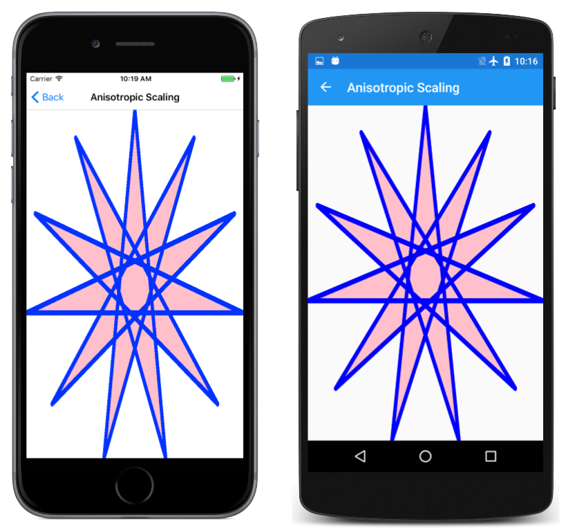 如果提供了此信息,则应可以导出适合将路径缩放到画布大小的缩放和平移因子。 “各向异性缩放”页用 11 角星证明了这一点。。 各向异性缩放意味着它在水平和垂直方向上不相等,这意味着星形不会保留其原始的纵横比。 下面是 PaintSurface 处理程序中的相关代码: