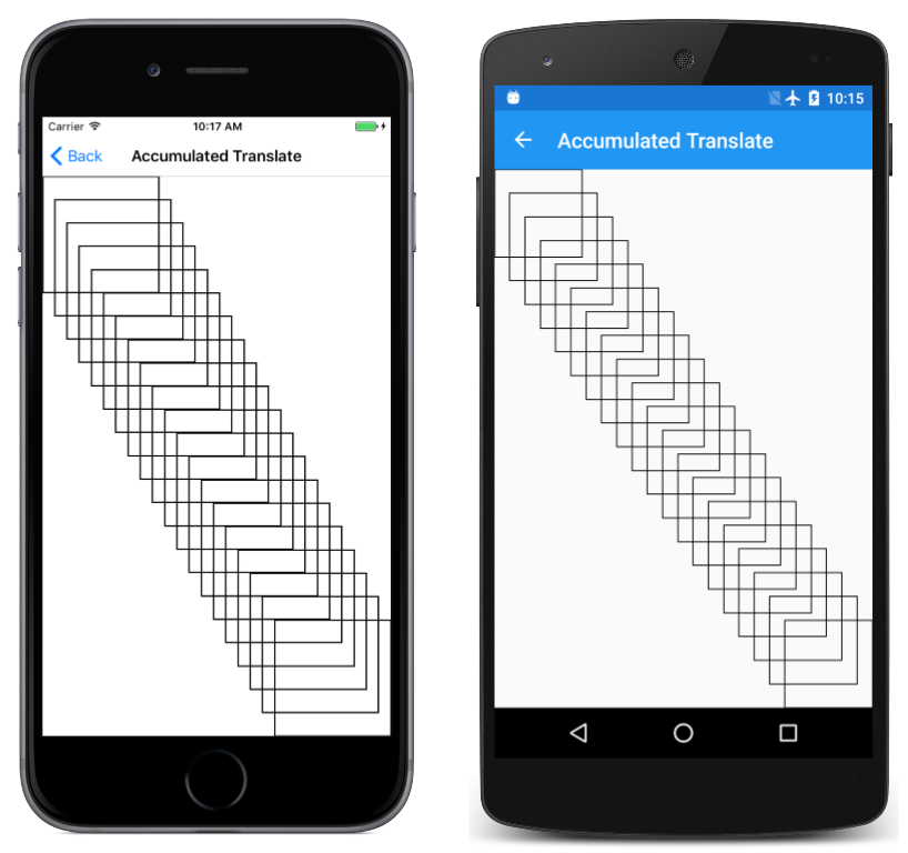 示例程序的“累积平移”页演示了对 Translate 方法的多次调用是累积性的AccumulatedTranslatePage 类显示同一矩形的 20 个版本,每个版本都与前一个矩形有足够的偏移,以便它们沿着对角线拉伸。 下面是 PaintSurface 事件处理程序: