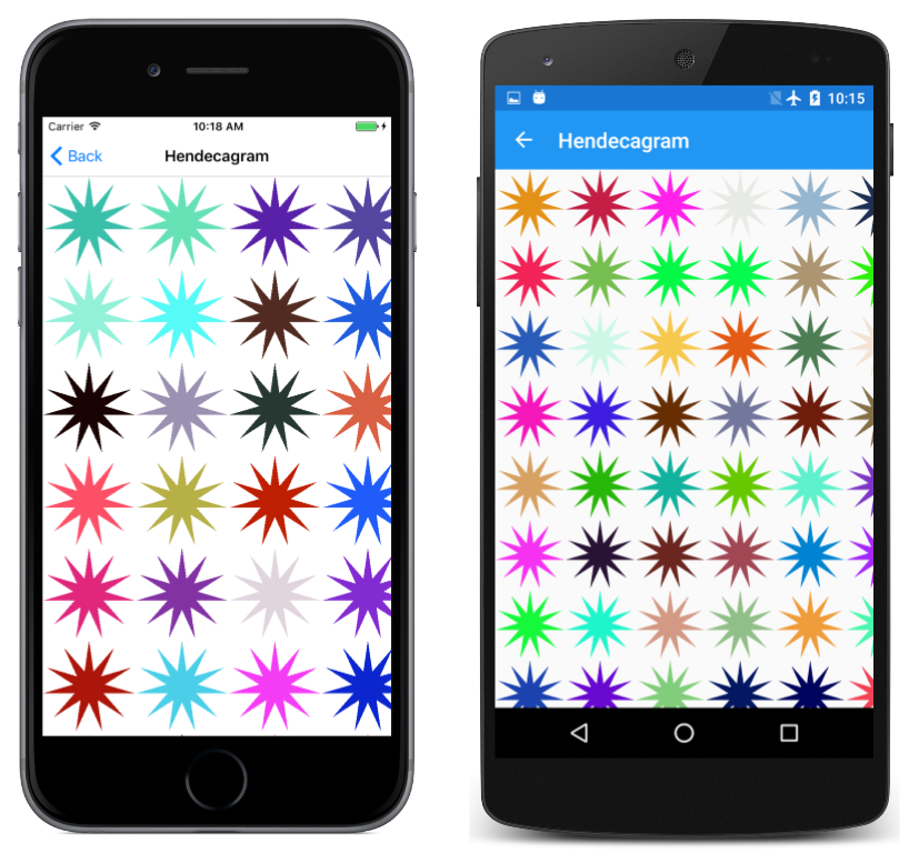 如果在不进行任何变换的情况下呈现此路径,则中心将位于 SKCanvas 的左上角,并且只有四分之一可见。 HendecagramPagePaintSurface 处理程序改用 Translate 在画布上平铺星形的多个副本,每个副本的颜色是随机的: