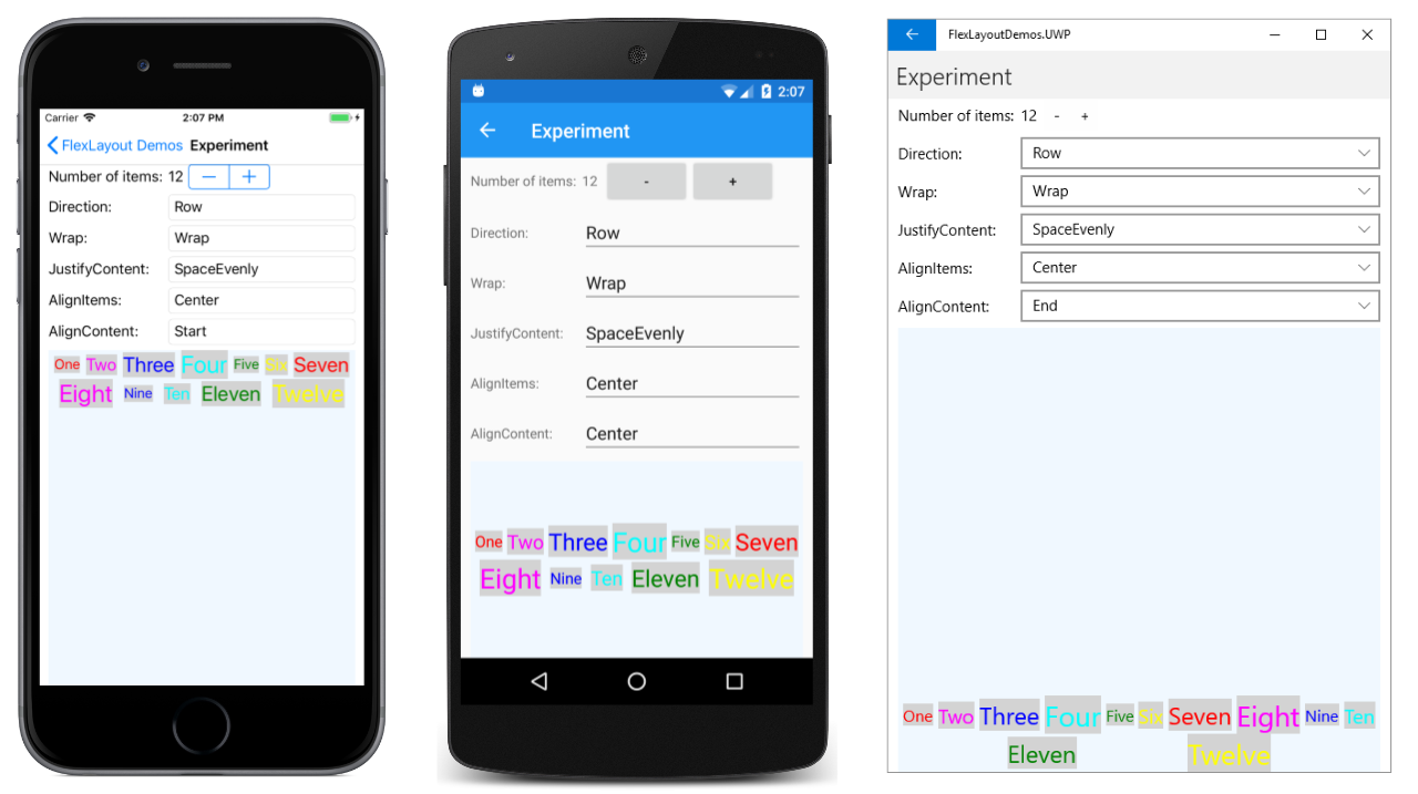 在这三个屏幕截图中,Wrap 属性设置为 Wrap。 Start 默认值显示在之前的 Android 屏幕截图中。 此处的 iOS 屏幕截图显示了 Center 选项:所有项都移动到中心。 以字 Space 开头的三个选项分配项未占用的额外空间。 SpaceBetween 在项之间分配相等的空间;SpaceAround 在每个项周围放置相等的空间,而 SpaceEvenly 在每个项之间以及行上第一项之前和最后一项之后放置相等的空间。