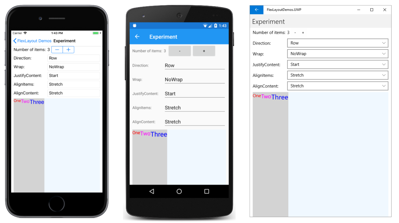 在 iOS 屏幕截图中,所有子元素的顶部都对齐。 在 Android 屏幕截图中,项目垂直居中,以最高的子元素为基础。 在 UWP 屏幕截图中,所有项的底部都对齐。
