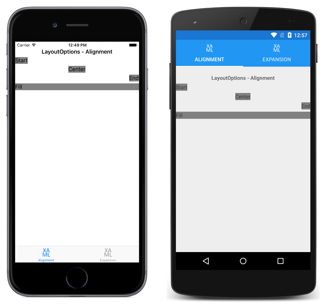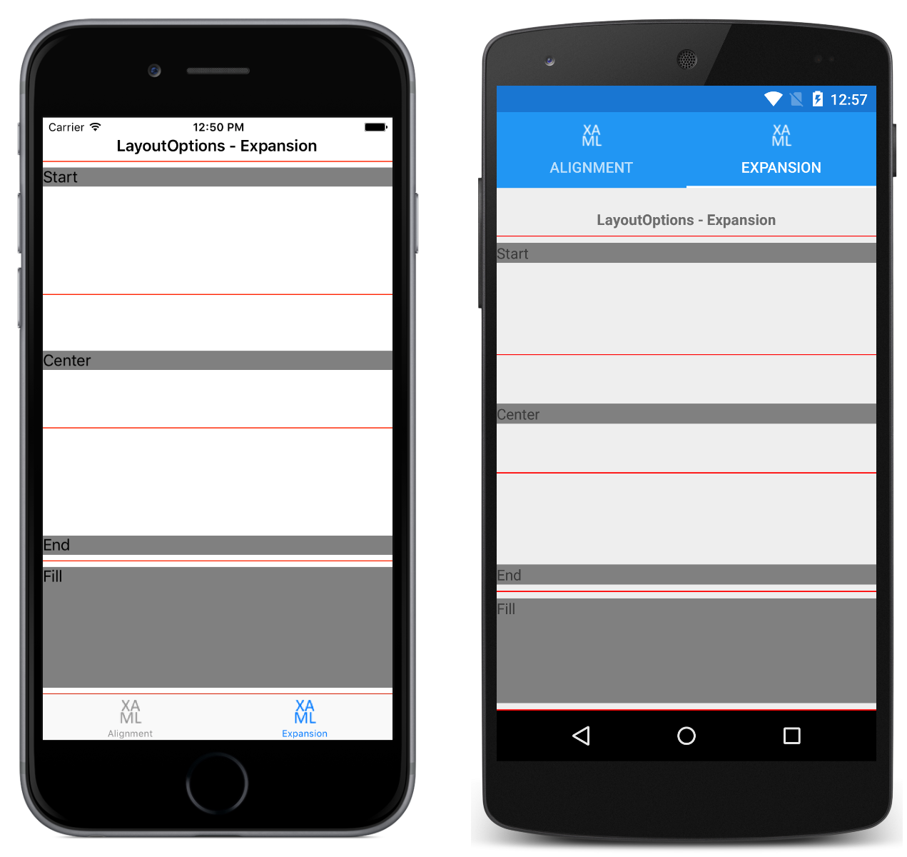 本文介绍了每个 LayoutOptions 结构值对视图的对齐方式和扩展的影响(相对其父视图而言)。 Start、Center、End 和 Fill 字段用于定义视图在父布局内的对齐方式,而 StartAndExpand、CenterAndExpand、EndAndExpand 和 FillAndExpand 字段用于定义对齐方式首选项,并确定视图是否会在 StackLayout 内占用更多可用空间。