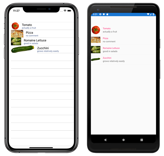 ListView 中的数据项称为单元格。 每个单元格对应于一行数据。 有内置单元格可供选择,你也可以定义自己的自定义单元格。 内置单元格和自定义单元格都可以用 XAML 或代码进行使用/定义。