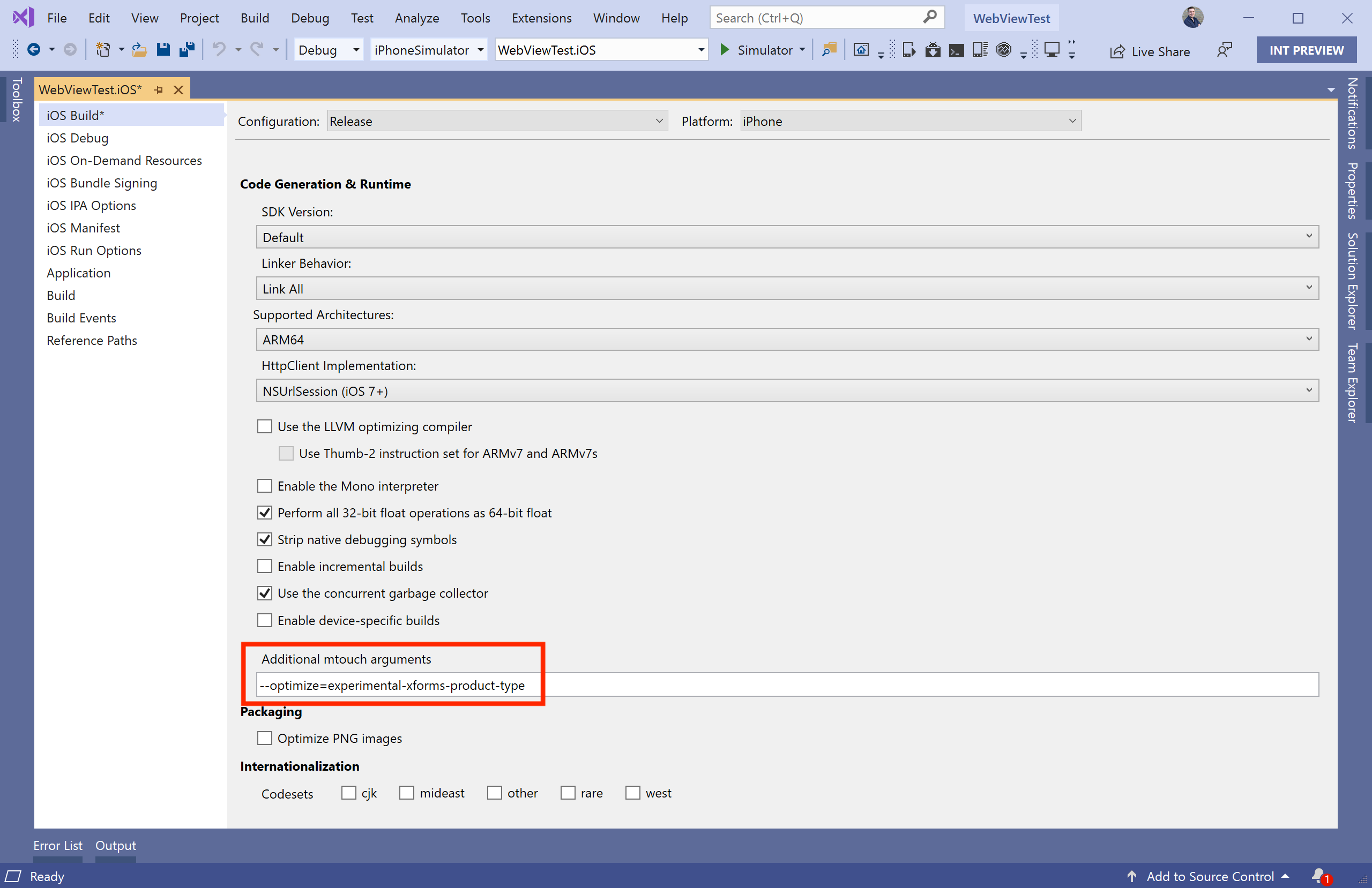--optimize=experimental-xforms-product-type(以及其中可能已存在的任何值)。 注意:此标志与设置为“仅限 SDK”或“链接所有”的“链接器行为”结合使用。 如果出于任何原因,在将“链接器行为”设置为“全部”时出现错误,则很可能是应用代码或链接器不安全的第三方库中存在问题。 有关链接器的详细信息,请参阅链接 Xamarin.iOS 应用。 - 更新所有生成配置 – 使用窗口顶部的“配置”和“平台”列表来更新所有生成配置。 要更新的最重要配置是 Release/iPhone 配置,因为它通常用于创建所需的版本进行 App Store 提交。