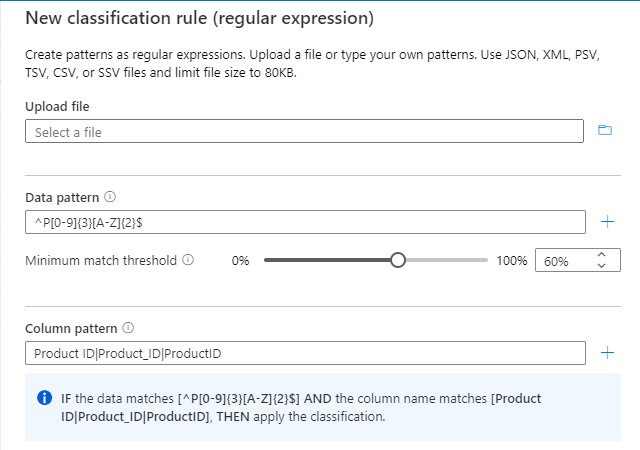 如果要为同一分类规则分类多个列模式,请使用管道 (|) 字符分隔的列名。 例如,对于 “产品 ID”、“ Product_ID”、“ ProductID”等列,请写入列模式,如下图所示: