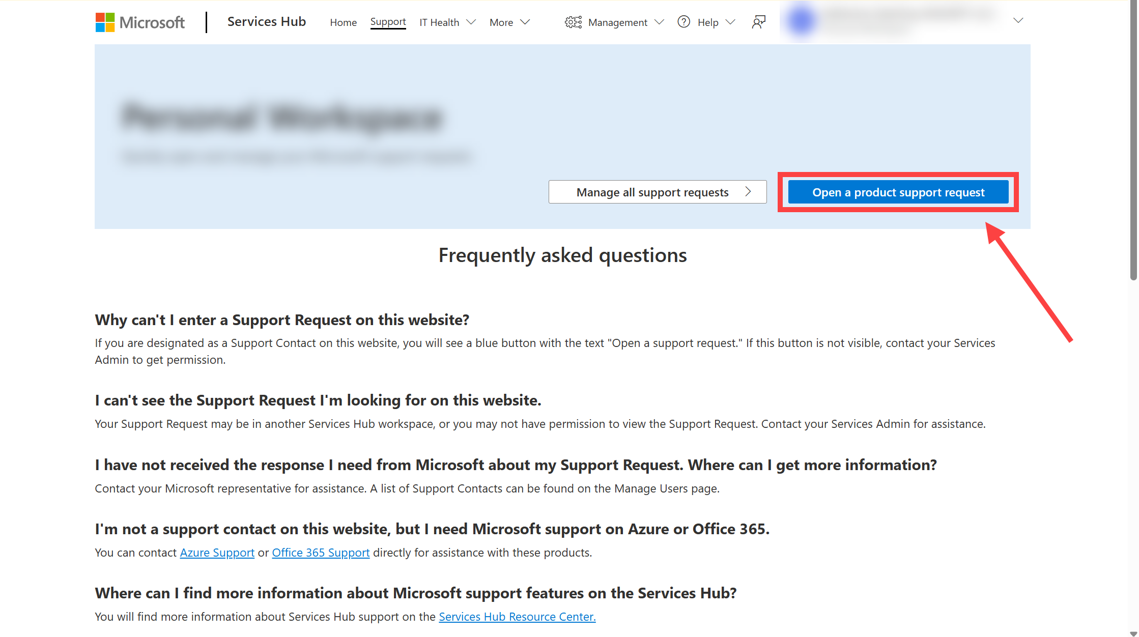 登录到 Services Hub,然后在页面顶部的功能区中选择“支持”。