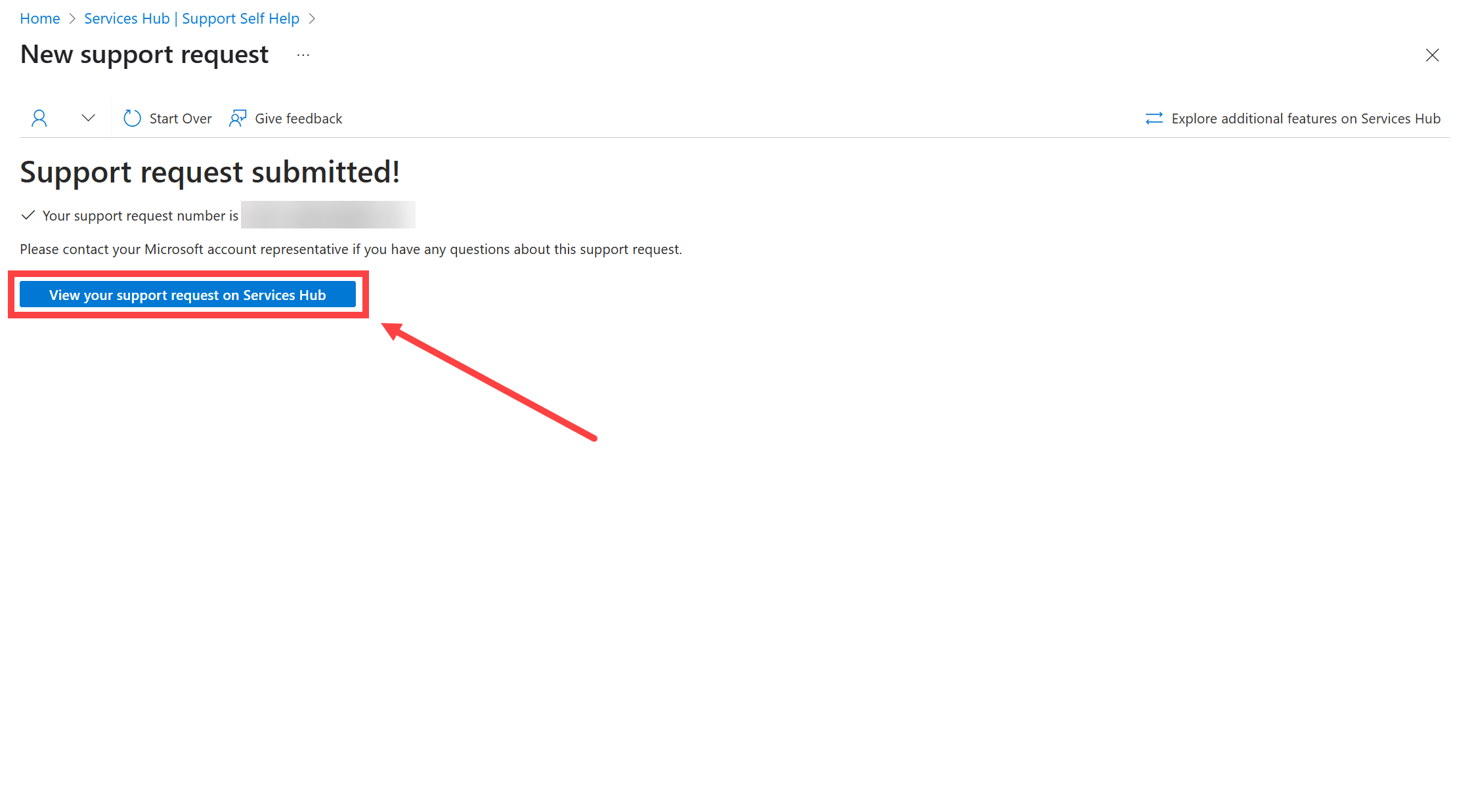 在确认屏幕中,选择“在 Services Hub 上查看支持请求”。