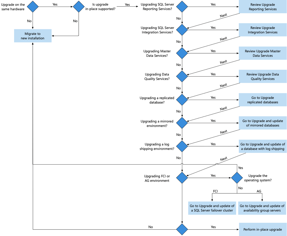 当为了最小化故障时间和风险而计划将数据库引擎从 SQL Server 的先前版本进行升级时,有几种方法可以考虑。 你可以执行就地升级、迁移到新安装或者执行滚动升级。 下面的图表可帮助你在这些方法中进行选择。 文中还讨论了图表中的每种方法。 若要帮助你了解关系图中的决策点,还请查看 “计划和测试数据库引擎升级计划”。