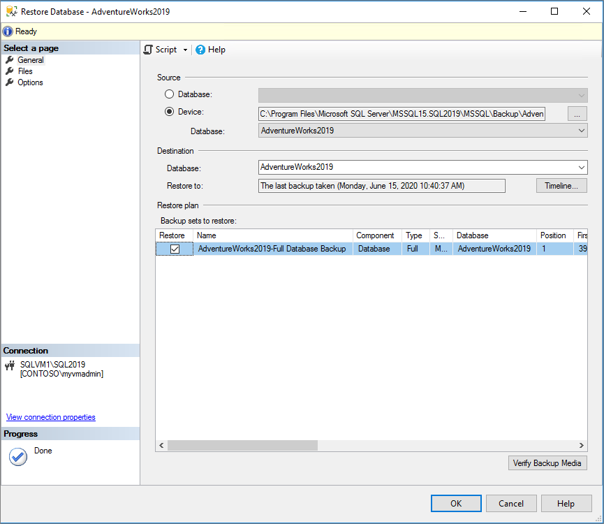 显示“还原数据库”窗口的屏幕截图。要还原的备份集和“确定”选项突出显示。