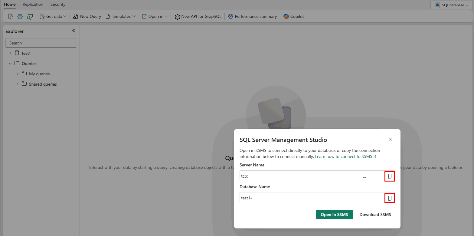 在 Fabric 门户中找到 SQL 数据库的服务器名称和数据库名称。