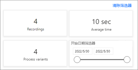 由流程挖掘呈现的其他视觉对象有助于进一步分解流程图中显示的信息。 例如,以下屏幕截图显示录制内容数、流程变型数和完成流程的平均时间。 还显示开始日期筛选器,如果流程中的某些内容在特定日期发生变化,该筛选器可能特别有用。