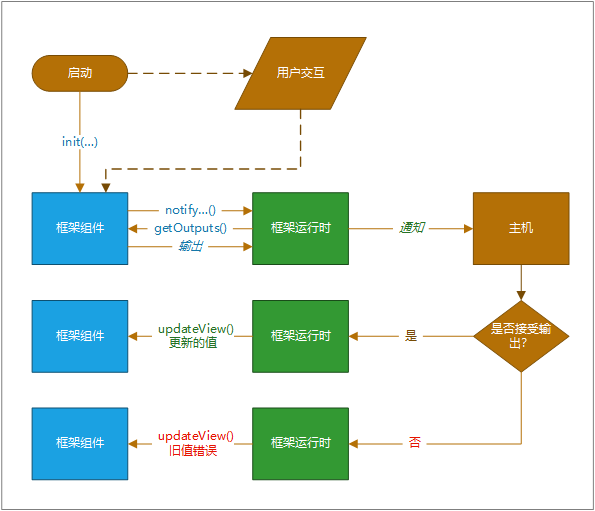 运行时随后通知主机,主机将验证输出。 如果输出有效,它将对组件调用 updateView 方法。 如果输出由于任何原因无效(例如,业务规则发现新输出无效),它将调用 updateView 方法并传递旧值以及错误消息。 在任一应用场景中,您的组件都可以更新用户界面,并在适当时显示错误消息。