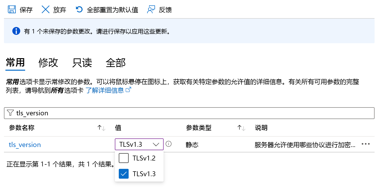- 在“服务器参数”部分的“顶部”或“全部”筛选器的搜索栏中输入 tls_version。
