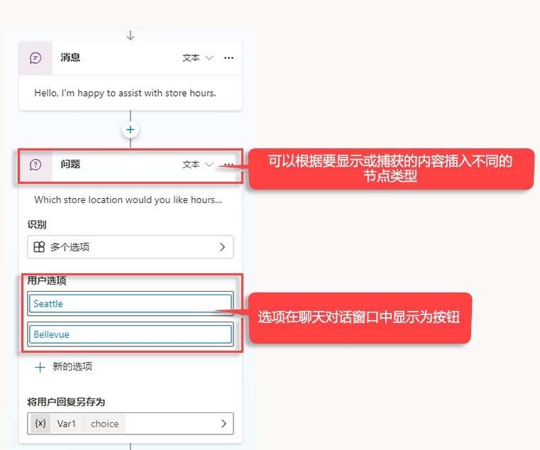 下图显示提出问题节点,将用于向客户询问他们想要知道哪个商店位置的营业时间。 此外,向客户提供两个可供选择的多选选项:西雅图和贝尔维尤。