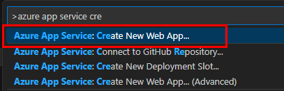 搜索并选择 Azure 应用服务:创建新的 Web 应用...。 请勿 选择 “高级 ”选项。