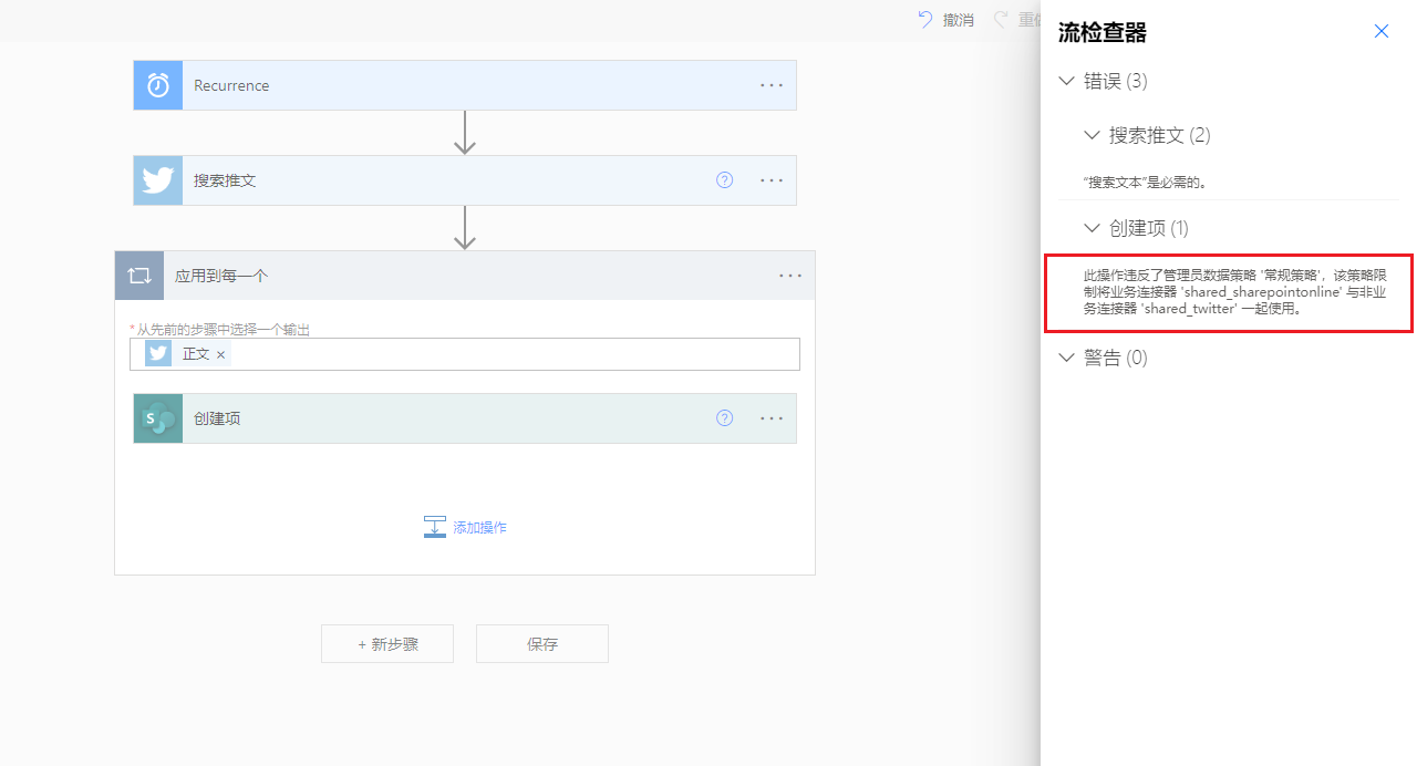 数据不能在不同组的连接器之间共享。 例如,如果将 SharePoint 和 Outlook 连接器放在业务组,并且将 Twitter 放入非业务组中,则制作者无法创建同时使用 SharePoint 和 Twitter 连接器的流。 因此,本操作限制 Microsoft Power Platform 中这两个服务之间的数据流。