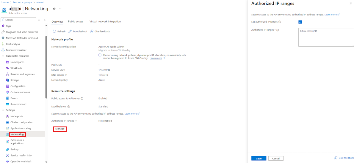 API 服务器授权的 IP 范围 可能已在群集的 API 服务器上启用,但 IP 范围中不包括客户端的 IP 地址。 若要检查此功能是否已启用,请参阅 Azure CLI 中的以下 az aks show 命令是否生成 IP 范围列表:
