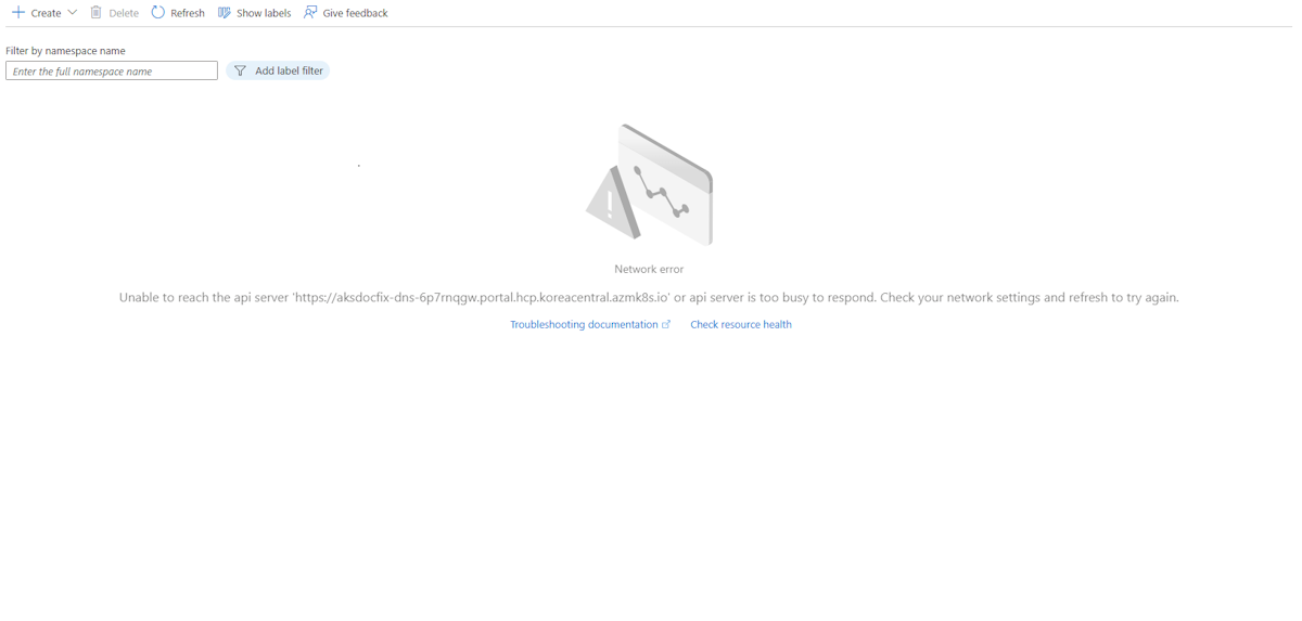 无法访问 API 服务器“https://< API-server-FQDN>”或 API 服务器太忙,无法响应。 检查网络设置并刷新以重试。