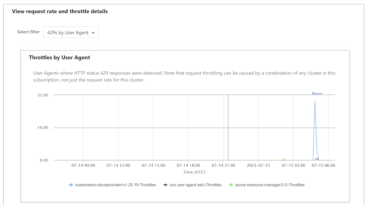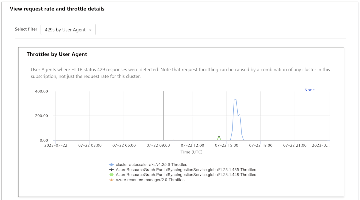 在 “查看请求速率和限制详细信息”诊断中按用户代理进行筛选时,如果发现发出过多 GET 请求的第三方应用程序(如监视应用程序),请更改这些应用程序的设置以减少 GET 调用的频率。 此外,请确保应用程序客户端在调用 Azure API 时使用指数退避。