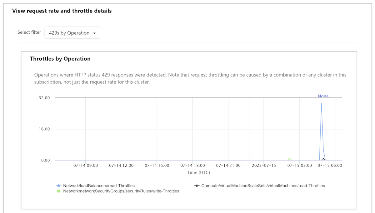 如果在群集中找到限制,可以在“查看请求速率”和“限制详细信息”诊断中看到 限制详细信息 。 从“选择筛选器”下拉列表中选择 429s,可以看到云提供商请求被限制为 03:00 到 06:00。