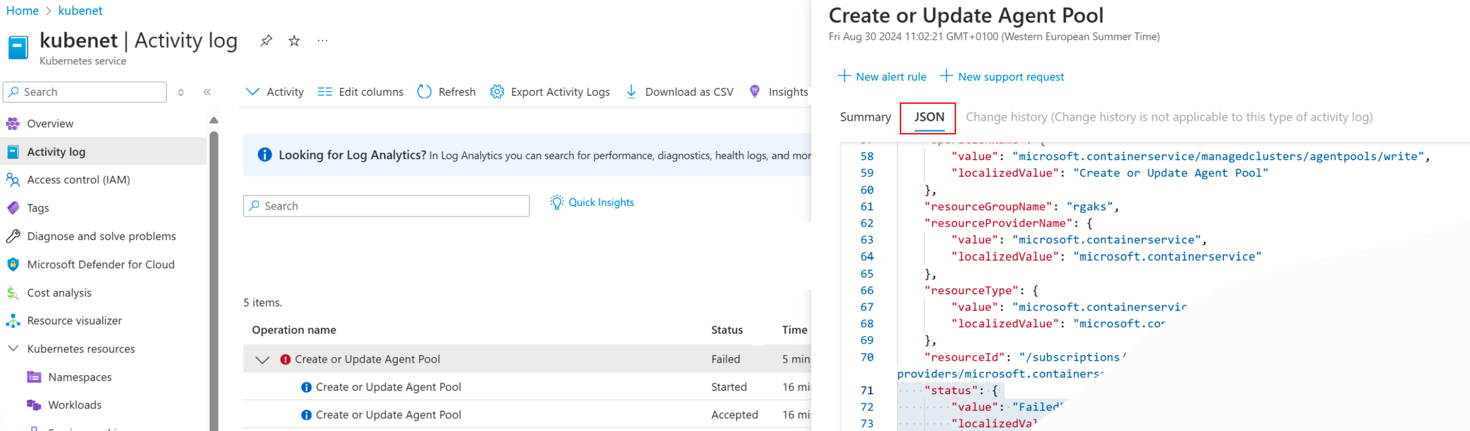 根据故障的类型及其发生情况,可能无法登录到群集以获取更多详细信息。 但是,如果群集已创建并显示在Azure 门户中,则应能够登录并运行 kubectl 命令。