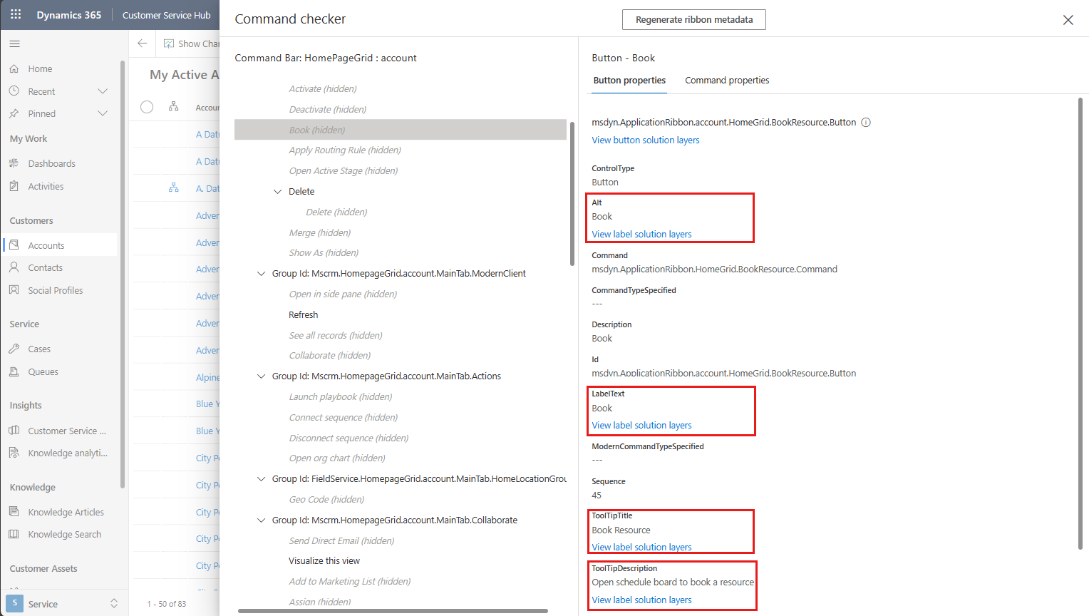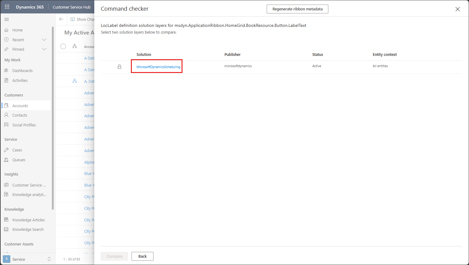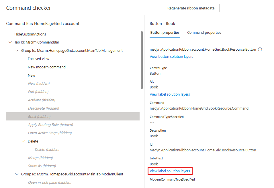 <RibbonDiffXml>,因此无法在命令检查器中检查。列出了自定义文本的解决方案。 在此示例中,只有一个解决方案具有自定义 的 LabelText。