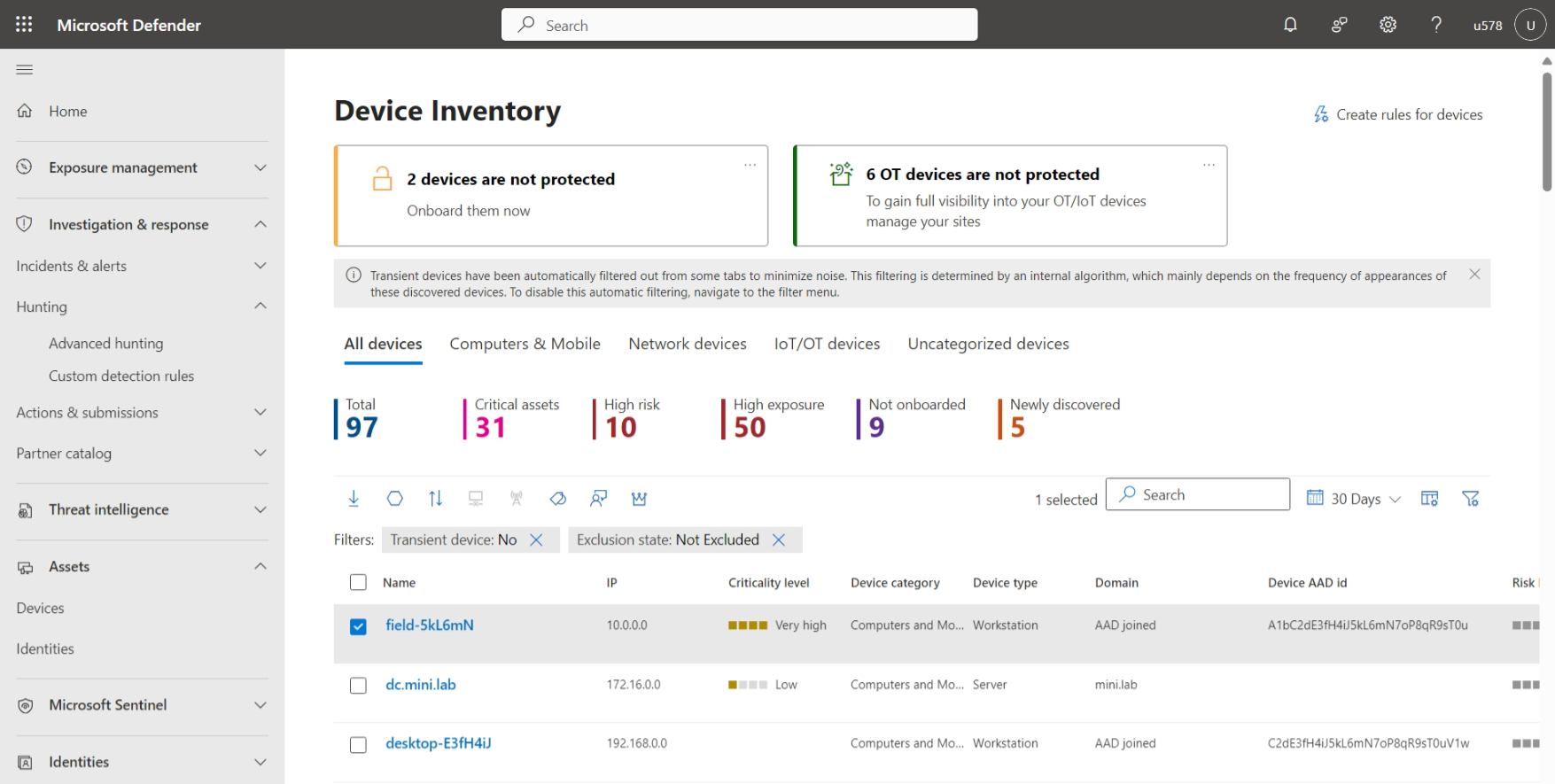 | Devices | 在“ 设备清单 ”页上,大致了解你有权访问的每个租户中发现的设备。 按类型查看设备,并专注于高风险或关键设备。 通过为上下文添加标记,以逻辑方式对设备进行分组,并排除不想评估的设备。 启动设备的自动调查。 |