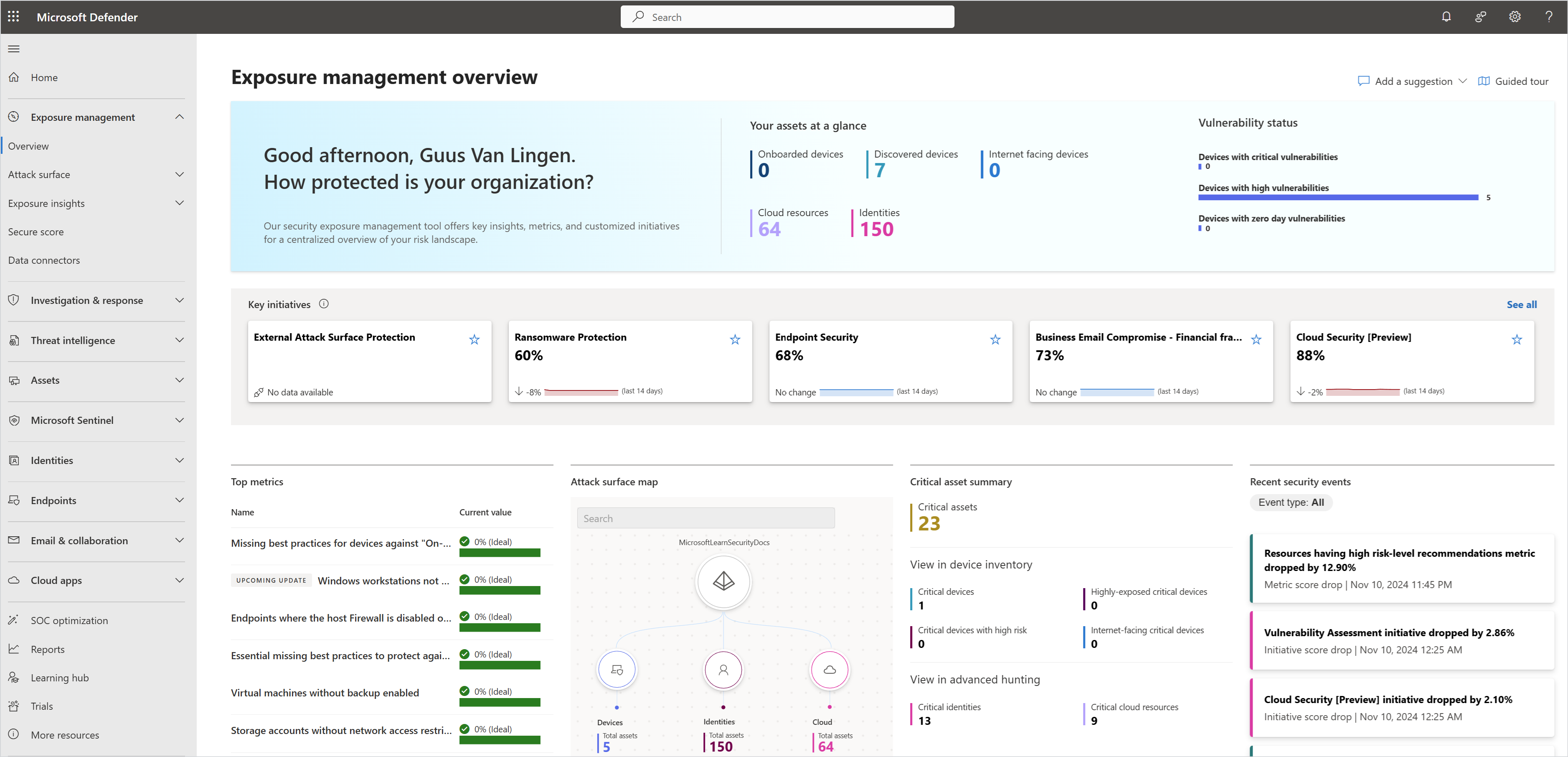 | 曝光管理概述 | 此仪表板提供设备和云资源的快速视图,包括面向 Internet 的设备和关键资产。 了解关键安全计划的执行情况,并深入了解高价值漏洞的顶级指标。 获取不同类型的资源的公开级别,并跟踪一段时间内的安全进度。 |