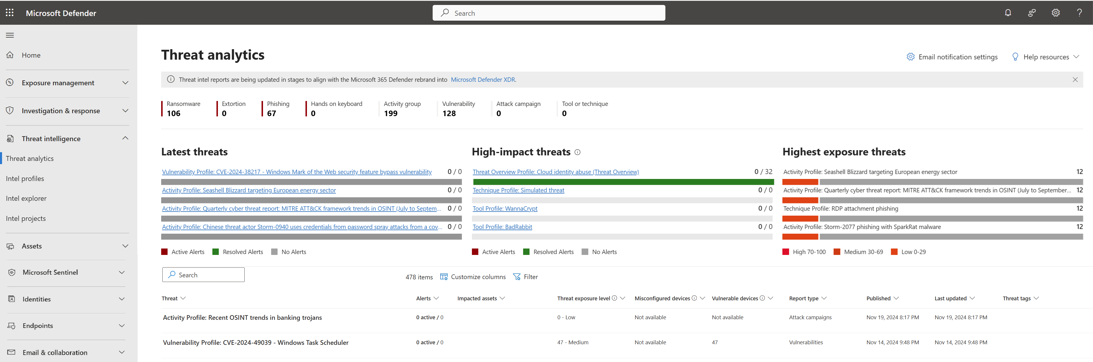 在门户的“ 威胁情报 ”部分中,直接了解当前和正在进行的威胁活动,并访问 Defender 威胁情报平台提供的威胁情报信息。