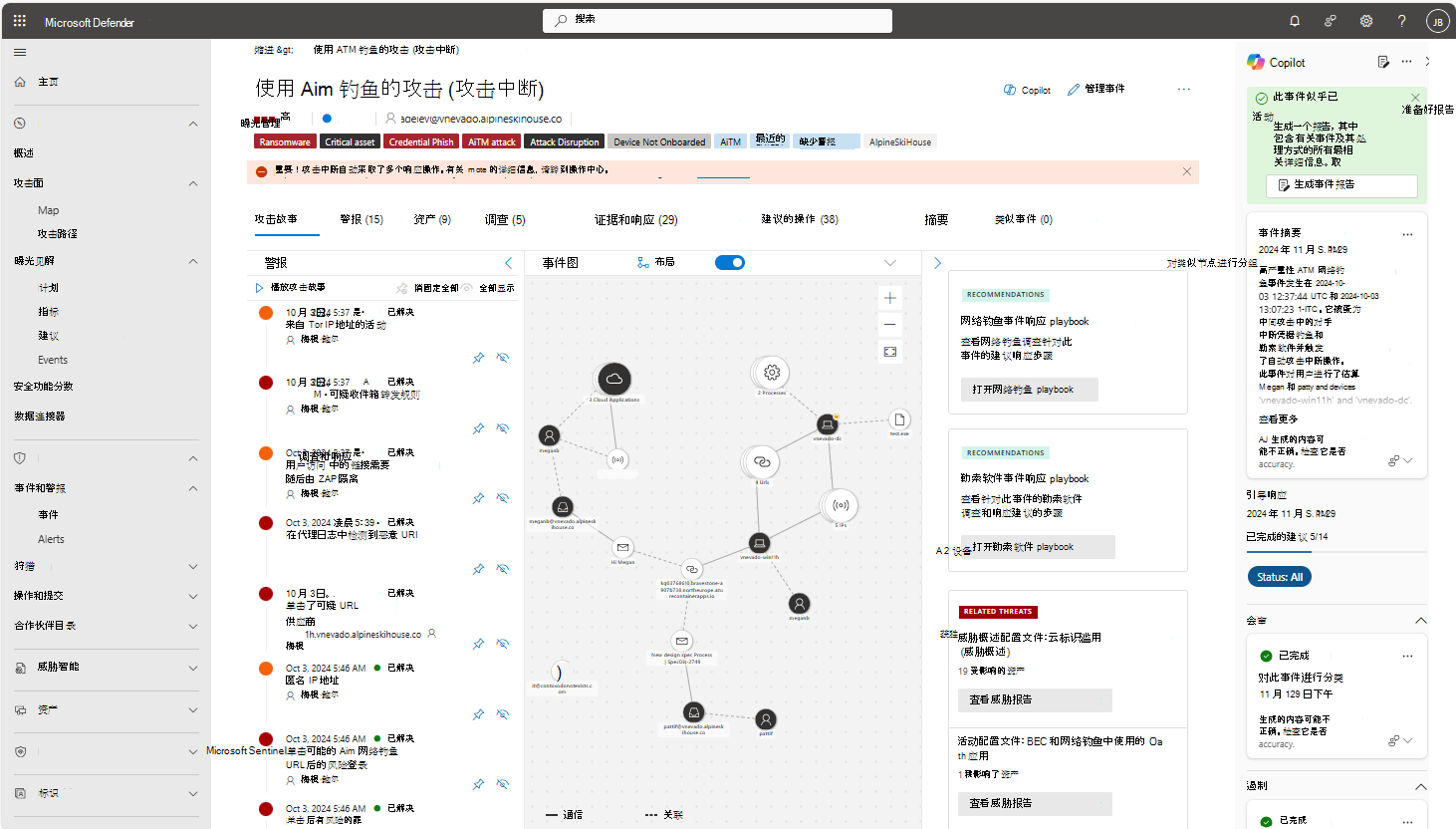 下图显示了 Microsoft Copilot 集成在 Defender 门户中的事件页中。
