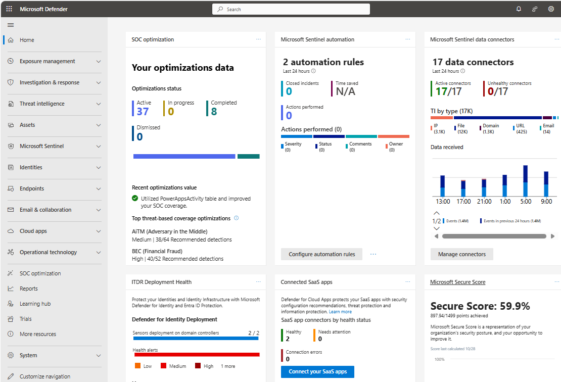 为了涵盖所有这些功能,Defender 门户结合了Microsoft Defender XDR、Microsoft Sentinel、Microsoft 安全风险管理 和Microsoft Defender门户中的智能 Microsoft Security Copilot 副驾驶®。 集成更多Microsoft Defender服务,以增加安全性,并提供针对复杂攻击的集成保护。 Defender 门户提供一个位置,用于监视、检测、调查、修正和应对入侵前后的网络安全风险和威胁。