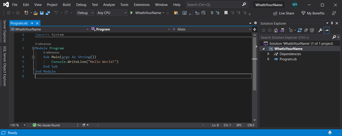 选择 Visual Basic 项目模板并命名项目后,Visual Studio 将创建 Program.vb 文件。 默认代码调用 WriteLine 方法,以在控制台窗口中显示文本字符串“Hello World!” 。