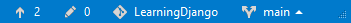从左到右,Git 控件栏显示传出/传入提交数(箭头 #/#)、未提交的更改数(铅笔 #)、当前分支名称和当前存储库名称。 主工具栏上的 Git 菜单上也提供了 Git 控件。
