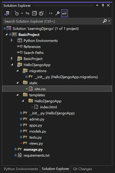 Visual Studio 将 site.css 文件添加到项目中,并在编辑器中打开该文件。 下面是更新的 Django 项目结构的示例: